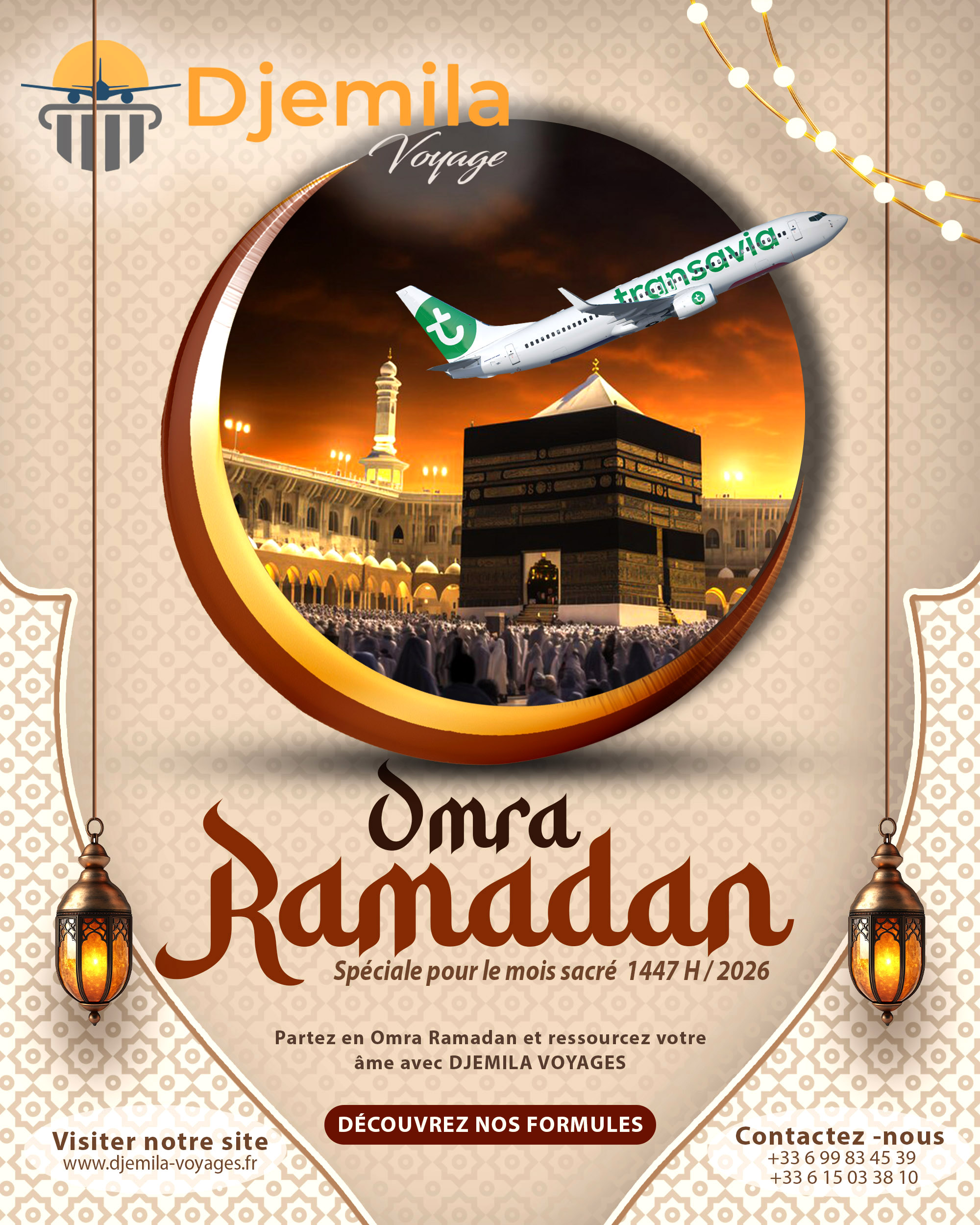 Vivez un Ramadan inoubliable au cœur des lieux saints avec Djemila Voyages. Spécialisés dans l’organisation de la Omra, nous vous offrons un service personnalisé pour que votre pèlerinage durant ce mois béni se déroule dans les meilleures conditions. Partez en toute sérénité et profitez d’un accompagnement complet pour une expérience spirituelle profonde et enrichissante.