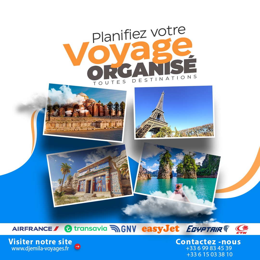 Chez Djemila Voyages, nous vous offrons une sélection de voyages organisés vers des destinations variées, conçus pour répondre à toutes vos attentes, que ce soit pour des séjours culturels, de détente ou spirituels. Nous vous accompagnons également dans l’achat de billets d’avion et de bateau, en vous garantissant les meilleures options en termes de confort, de prix et de flexibilité, pour des déplacements sans souci.